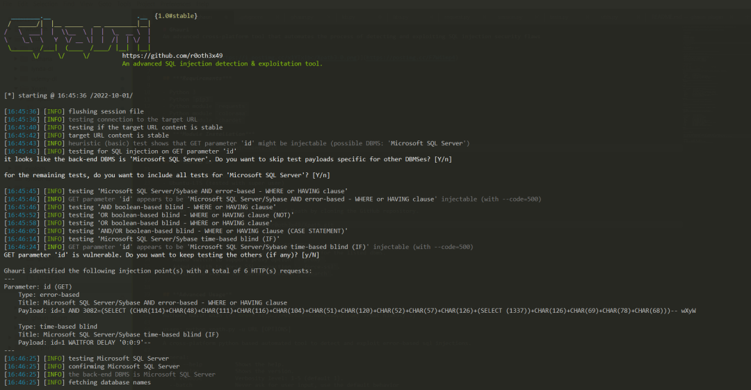 usage: ghauri -u URL [OPTIONS]A cross-platform python based advanced sql injections detection & exploitation tool.General:-h, --help Shows the help.--version Shows the version.-v VERBOSE Verbosity level: 1-5 (default 1).--batch Never ask for user input, use the default behavior--flush-session Flush session files for current targetTarget:At least one of these options has to be provided to define thetarget(s)-u URL, --url URL Target URL (e.g. 'http://www.site.com/vuln.php?id=1).-r REQUESTFILE Load HTTP request from a fileRequest:These options can be used to specify how to connect to the target URL-A , --user-agent HTTP User-Agent header value-H , --header Extra header (e.g. "X-Forwarded-For: 127.0.0.1")--host HTTP Host header value--data Data string to be sent through POST (e.g. "id=1")--cookie HTTP Cookie header value (e.g. "PHPSESSID=a8d127e..")--referer HTTP Referer header value--headers Extra headers (e.g. "Accept-Language: fr\nETag: 123")--proxy Use a proxy to connect to the target URL--delay Delay in seconds between each HTTP request--timeout Seconds to wait before timeout connection (default 30)--retries Retries when the connection related error occurs (default 3)--force-ssl Force usage of SSL/HTTPSInjection:These options can be used to specify which parameters to test for,provide custom injection payloads and optional tampering scripts-p TESTPARAMETER Testable parameter(s)--dbms DBMS Force back-end DBMS to provided value--prefix Injection payload prefix string--suffix Injection payload suffix stringDetection:These options can be used to customize the detection phase--level LEVEL Level of tests to perform (1-3, default 1)--code CODE HTTP code to match when query is evaluated to True--string String to match when query is evaluated to True--not-string String to match when query is evaluated to False--text-only Compare pages based only on the textual contentTechniques:These options can be used to tweak testing of specific SQL injectiontechniques--technique TECH SQL injection techniques to use (default "BEST")--time-sec TIMESEC Seconds to delay the DBMS response (default 5)Enumeration:These options can be used to enumerate the back-end databasemanagment system information, structure and data contained in thetables.-b, --banner Retrieve DBMS banner--current-user Retrieve DBMS current user--current-db Retrieve DBMS current database--hostname Retrieve DBMS server hostname--dbs Enumerate DBMS databases--tables Enumerate DBMS database tables--columns Enumerate DBMS database table columns--dump Dump DBMS database table entries-D DB DBMS database to enumerate-T TBL DBMS database tables(s) to enumerate-C COLS DBMS database table column(s) to enumerate--start Retrive entries from offset for dbs/tables/columns/dump--stop Retrive entries till offset for dbs/tables/columns/dump