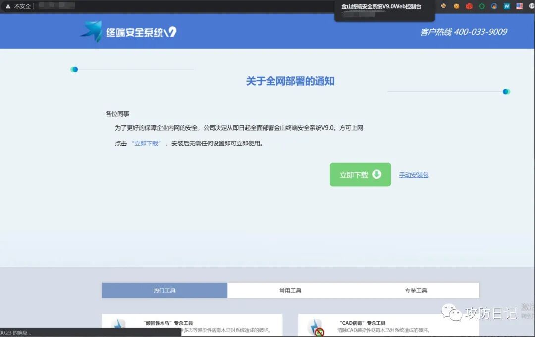 通过搜集进程信息和端口信息,发现内网存在金山杀毒,访问发现版本为v9(上传已修复)