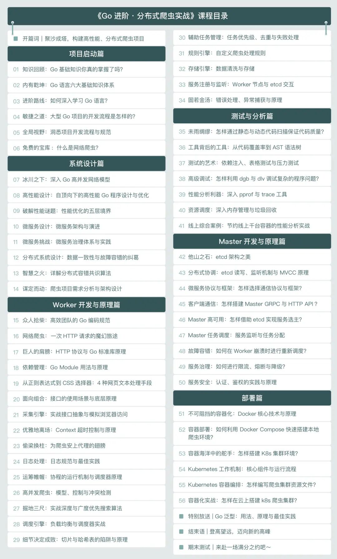 这张图来自我在 Go 社区的一位朋友郑建勋,在极客时间开设的新专栏《Go 进阶·分布式爬虫实战》,专栏以爬虫项目贯穿始终,带你构建企业级的分布式项目,还会交付高效的编码规范与研发工具、Go 语法背后的底层机制、高性能与可扩展的程序设计方法等内容。