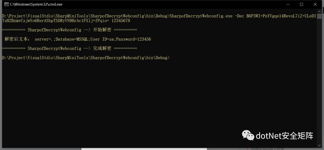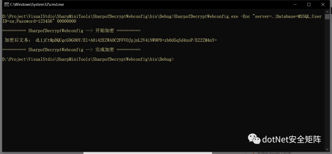 SharpofDecryptWebconfig.exe -Enc server=.;Database=MSSQL;User ID=sa;Password=123456 12345678