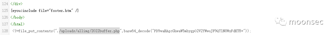 在文件末尾写入代码,当访问主页时就会触发改代码,将一句话内容写入到/uploads/allimg/2022buffer.php下