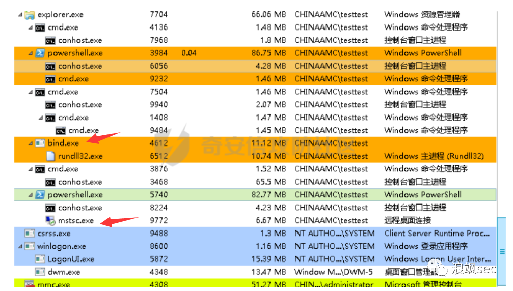 域控主机进程,存在恶意进程bind.exe, 远程登录进程mstsc.exe温馨提示:定位进程位置可以有多种方式,这里展示Everything