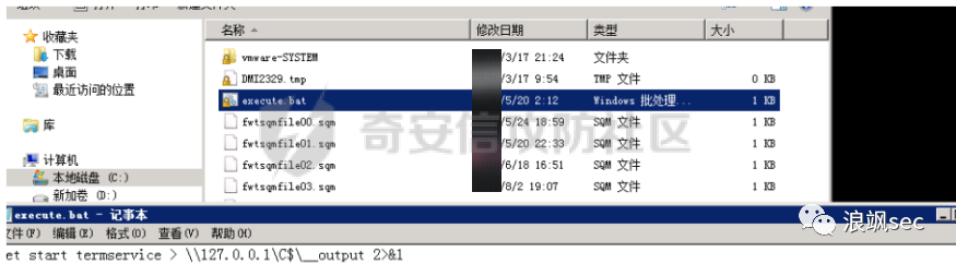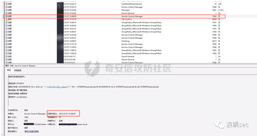 攻击者(内网):10.10.0.188 ----> 受害者(内网):10.7.0.21 样本启动时间:xx年5月20日 2:08:41 服务模式启动【系统日志 7045】攻击者同样创建了 名为:BTOBTO 服务,调用执行 execute.bat 程序