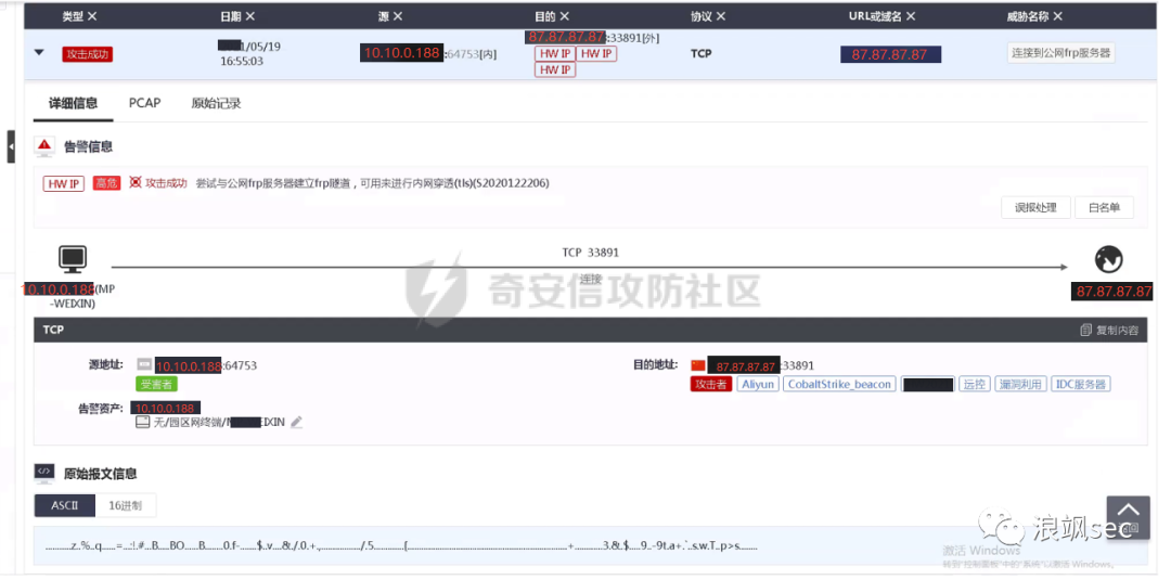 受害者:10.10.0.188 -->反连攻击者frp隧道:87.87.87.87:33891