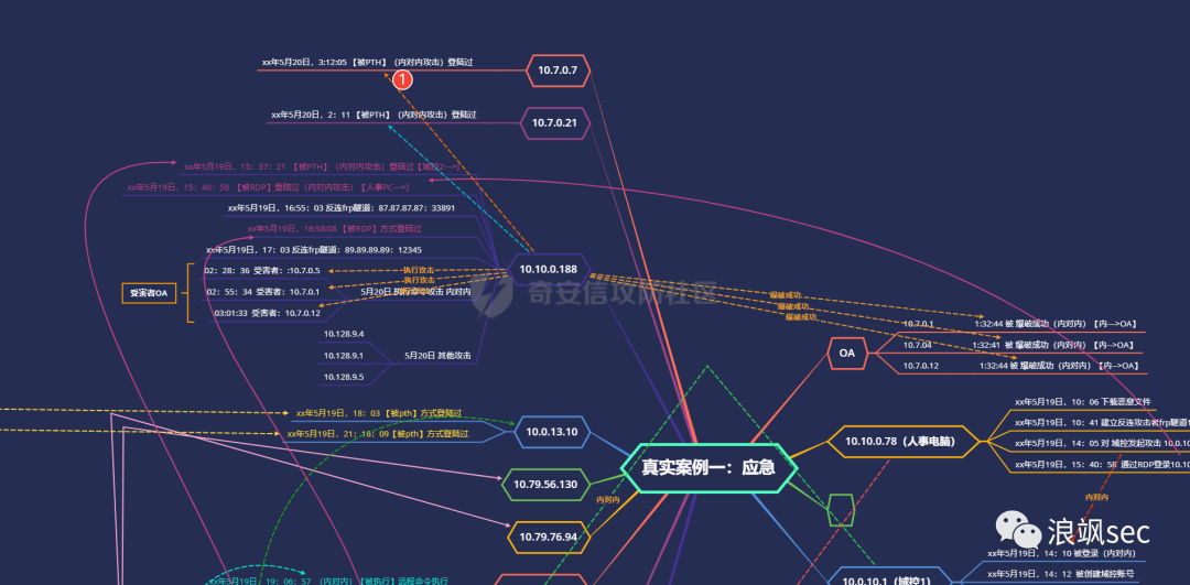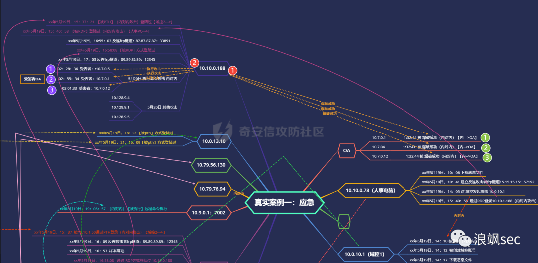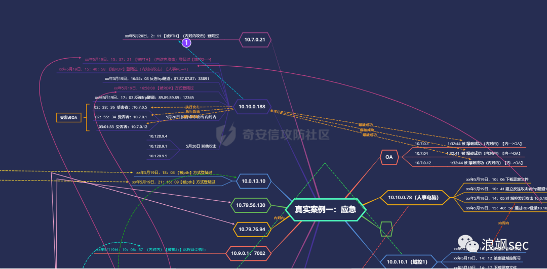 xx年xx月xx日,防守方在线接收到客户应急取证分析需求,经过分析师排查与分析,得到如下结论:⚫ 事件危害等级:严重。⚫ 取证目标设备:域控服务器、 OA 服务器等 29 台机器⚫ 取证结果:取证成功⚫ 传播途径:攻击者通过钓鱼员工终端主机,进行内网横向移动,入侵了域控服务器、 OA服务器、工控机器。⚫ 后续建议: