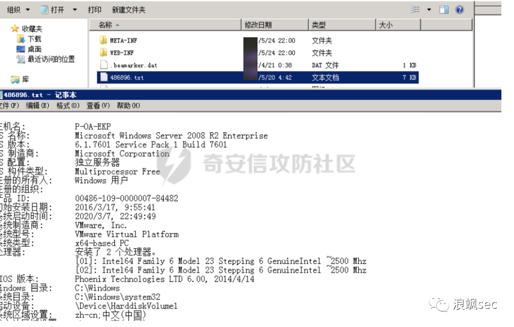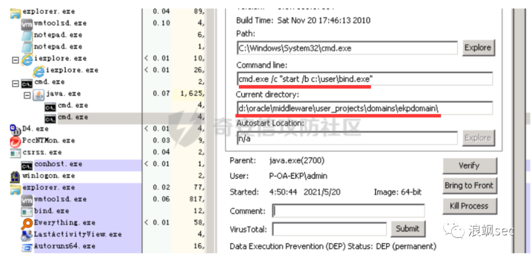 受害者(攻击者):10.10.1.50 -->受害者:10.10.0.188 由于,10.10.0.188对所有OA都发起了攻击,怀疑也被感染,因此上机排查 发现 java.exe 进程下存在两个子进程 cmd.exe, 其中一个cmd.exe 执行了恶意程序 bind.exe进入可疑程序-所在目录,发现目录存下一个 486896.txt 文本文件