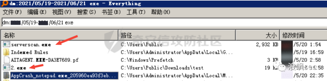 使用 Everything 工具查看 19 号至今修改时间较新的文件,发现名为 2.exe 于 serverscan.exe 的异常文件。