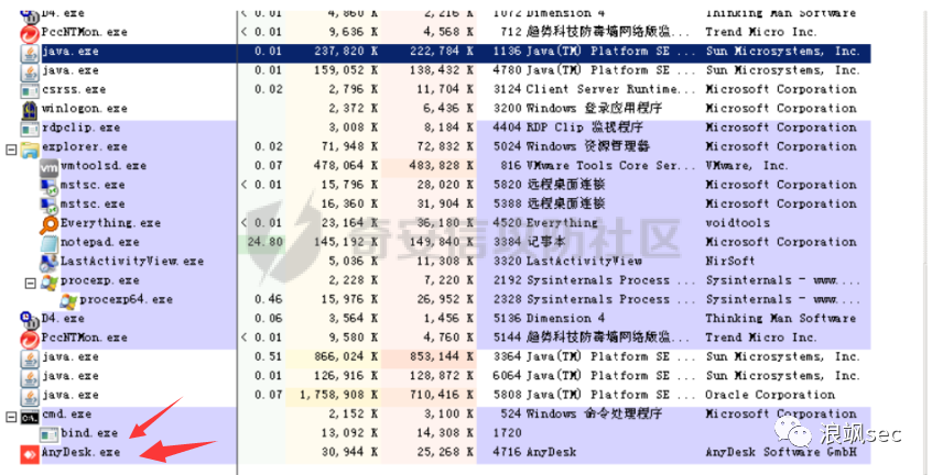由于,10.10.0.188对所有OA都发起了攻击,怀疑也被感染,因此上机排查 当前主机运行了恶意进程 bind.exe、远程工具 anydesk分析 anydesk 日志,均为连接失败,说明攻击者并未通过 anydesk 连接成功