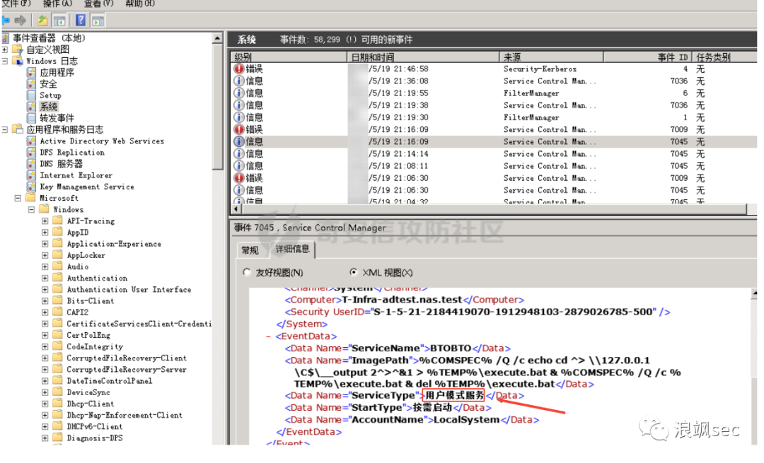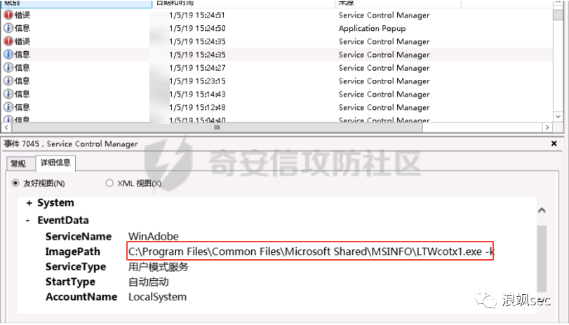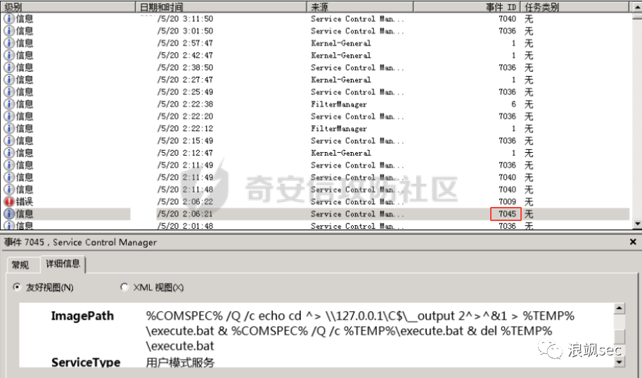 样本启动时间:xx年5月19日 15:24:35 服务模式启动【系统日志 7045】