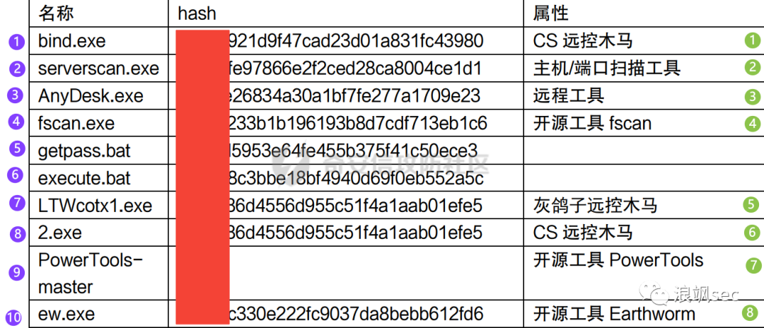通过排查失陷主机, 提取了攻击者留下的文件汇总如下 :攻击样本捕获:10个 攻击样本类型:9个