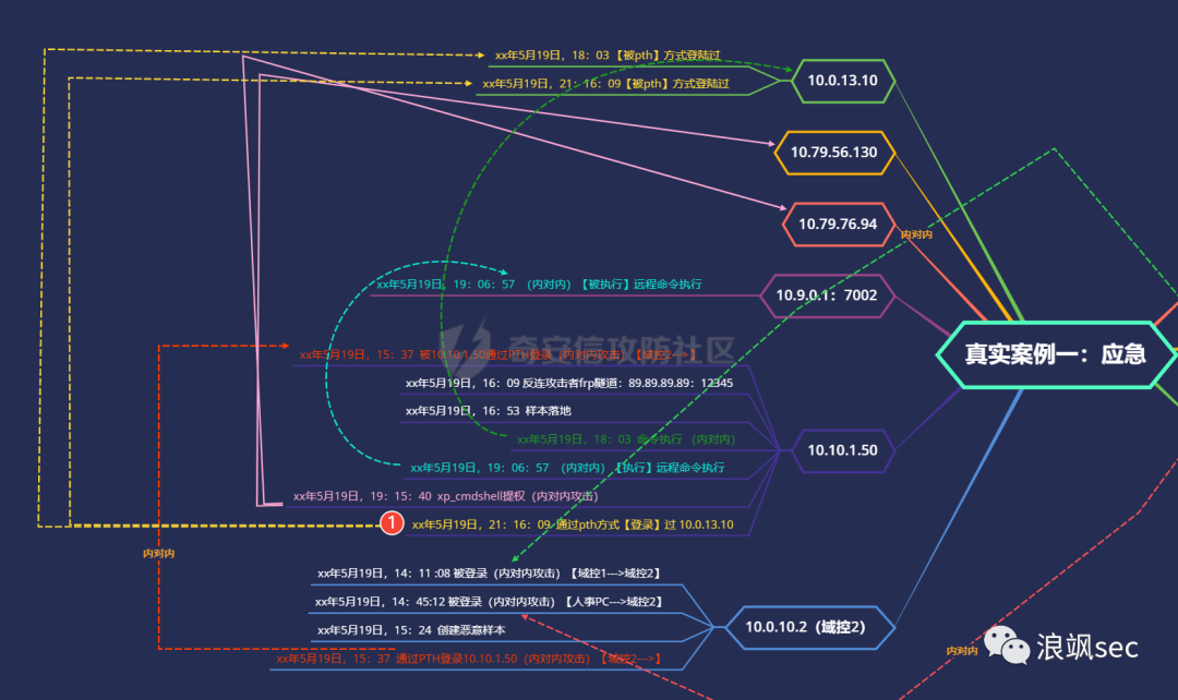排查登录日志,5月19日 15:37,10.0.10.2 通过pth攻击成功登录10.10.1.50登录类型3:网络登录,别人(10.0.10.2)登录自己(10.10.1.50)