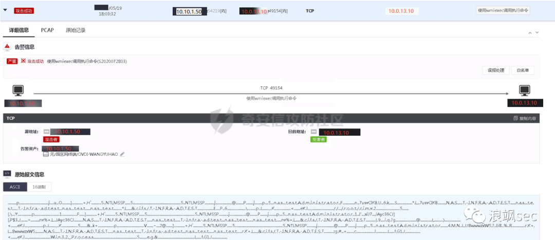 xx年5月19日,18:03 使用wmiexec执行命令执行攻击 内对内攻击