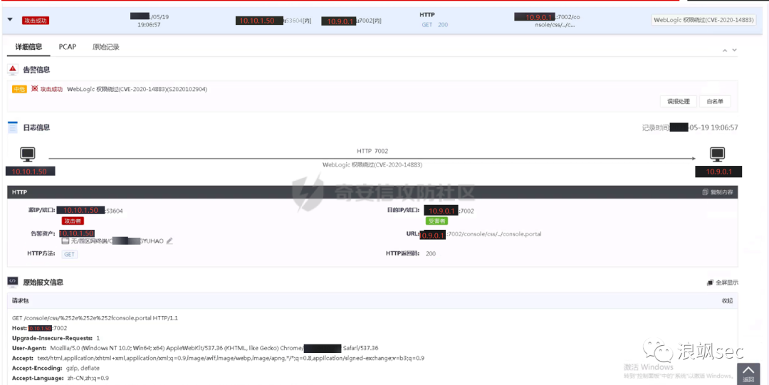 受害者(内网):10.10.1.50 --> 受害者(内网):10.0.13.10xx年5月19日,19:06:57 使用WebLogic 权限绕过(CVE-2020-14883)漏洞执行-远程命令执行攻击 内对内攻击