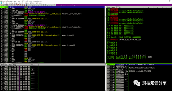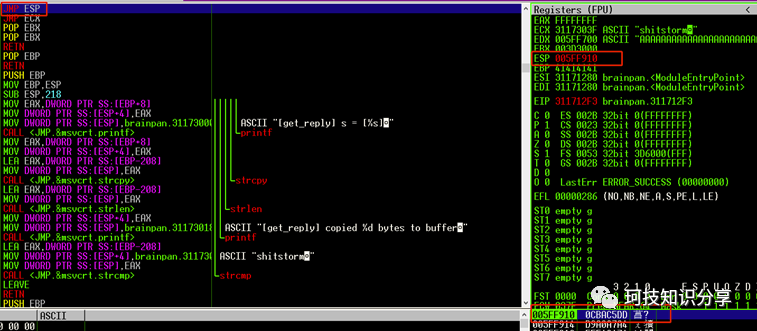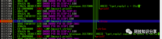 加载文件后弹出brainpan.exe的黑框,此时软件并未运行。界面和OD是一样的,左上汇编,右上寄存器,右下栈。往下翻一翻可以发现strcpy,F2打个断点。