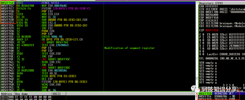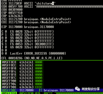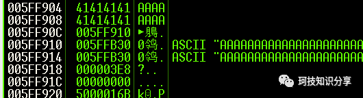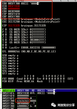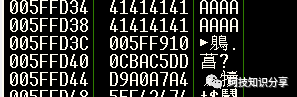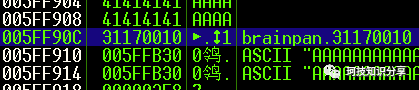 F8单步执行后,栈中出现41414141,此地址被写入eax。