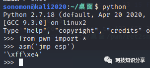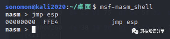 jmp esp汇编对应的16进制符为\xFF\Xe4,在kali中可生成。