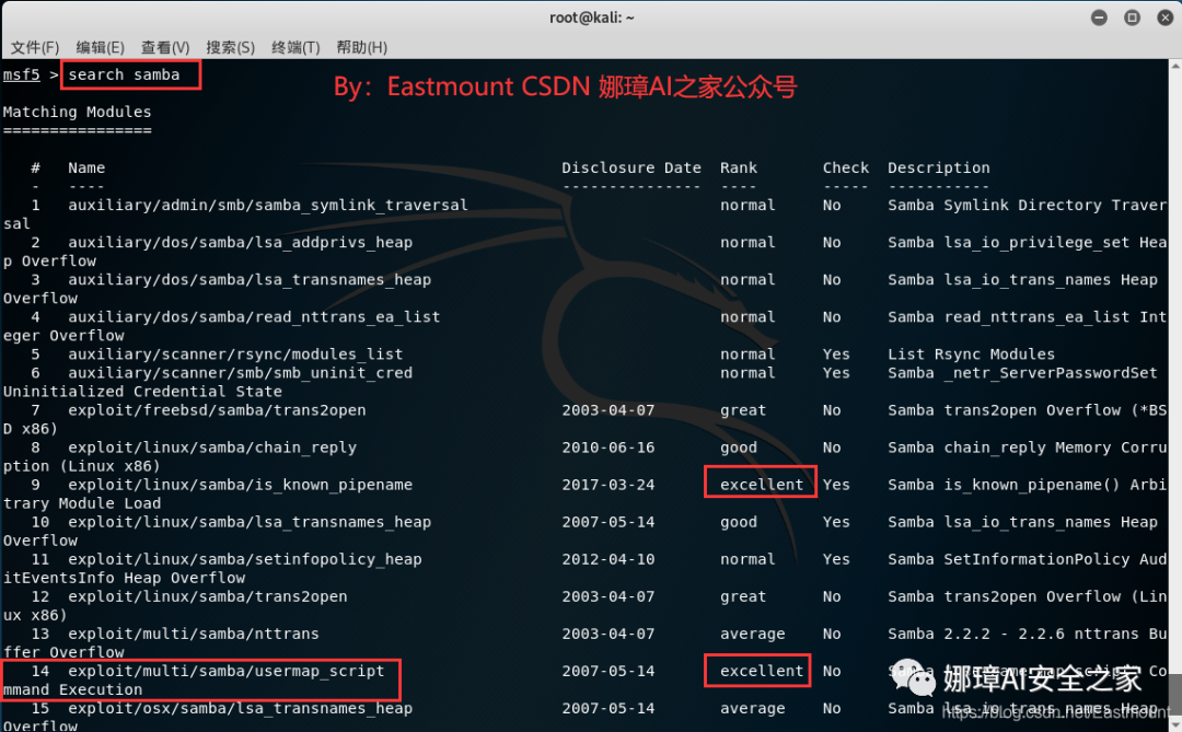 在Samba服务返回的漏洞利用模块列表中,我们选择“Excellent”最杰出且时间较新的漏洞,从而提高渗透成功率。