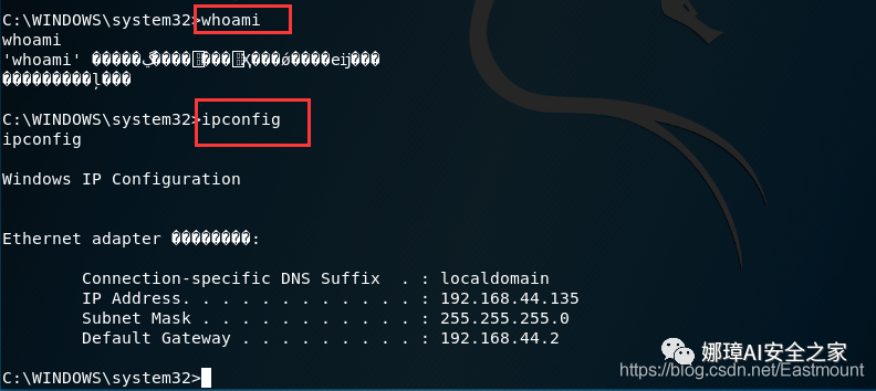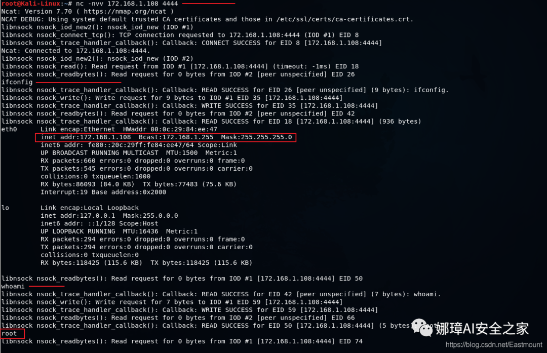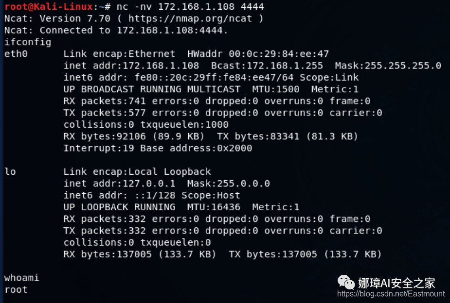 注入成功后,我们通过攻击机器 kali 来使用 nc 连接,因为我第一次使用的 nvv 参数,会显示所有的详细信息,所以内容比较咋。可以看到 ip 已经是目标机的 ip,身份是 root。