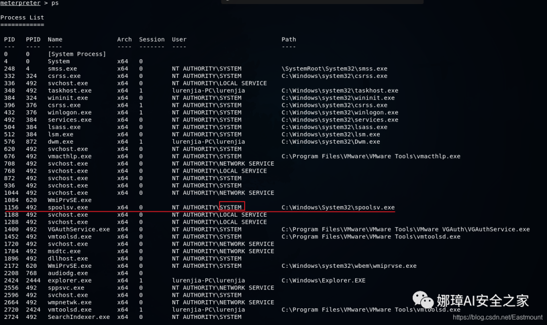 发现Meterpreter Shell进程的PID为524,Name为spoolsv.exe。