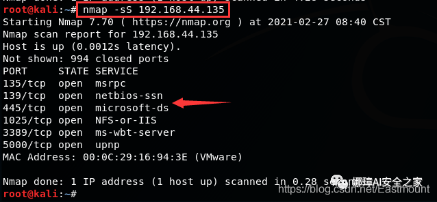 第一步,扫描靶机Windows XP系统是否开启445端口。
