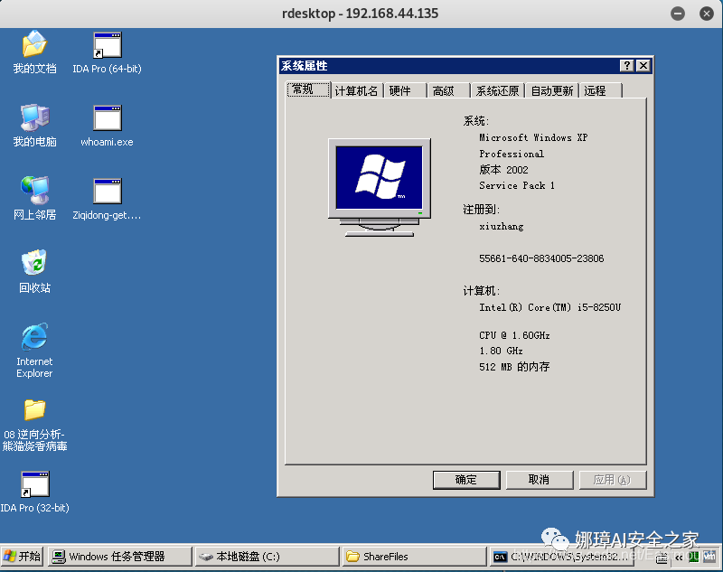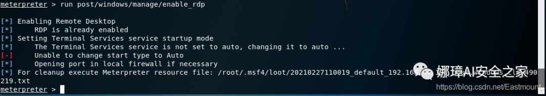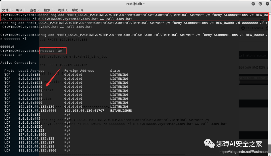 # 开启远程连接echo reg add "HKEY_LOCAL_MACHINE\SYSTEM\CurrentControlSet\Control\Terminal Server" /v fDenyTSConnections /t REG_DWORD /d 00000000 /f > C:\WINDOWS\system32\3389.bat && call 3389.bat# 查看网络端口netstat -an# 远程连接rdesktop 192.168.44.135