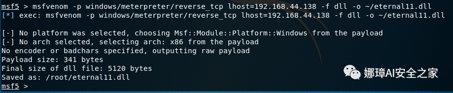 (5) 使用MSF自带的Msfvenom命令生成DLL。