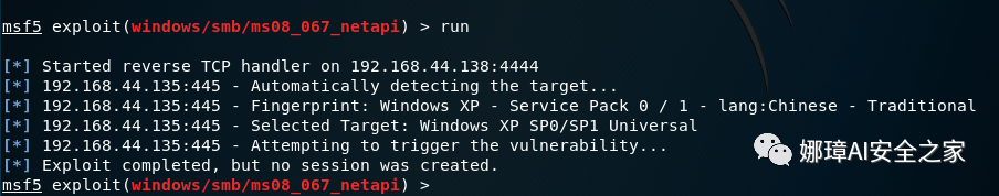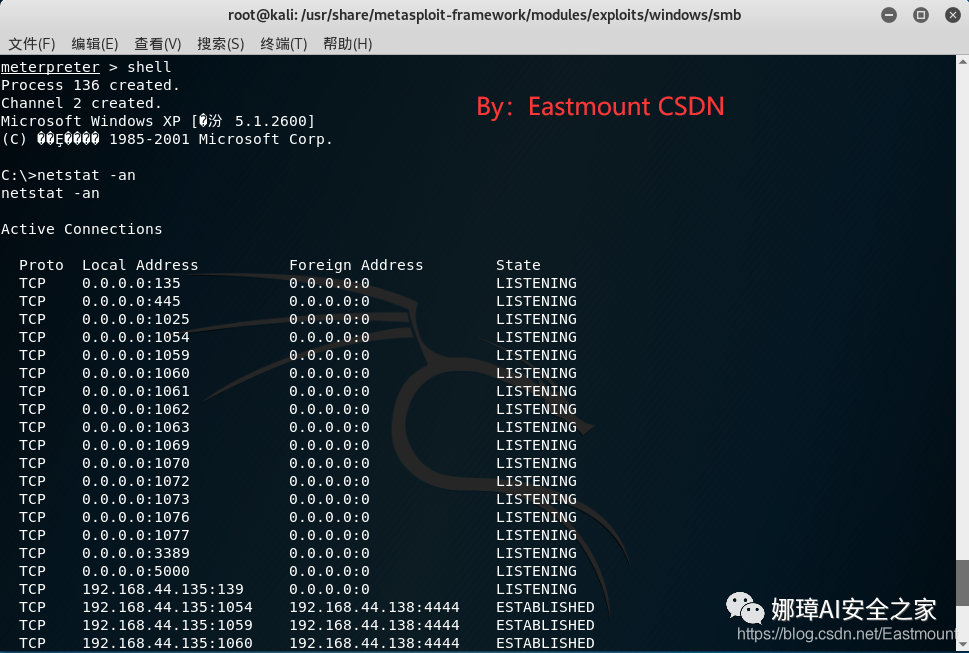 MSF发动攻击成功后会获取目标主机Shell,可以看到攻击主机和目标主机之间建立了Shell连接。同时可能会出现错误“Exploit completed, but no session was created”,需要注意目标主机版本信息,选择对应的攻击载荷及漏洞利用模块。建议读者多尝试各种Exploit和Payload的组合。