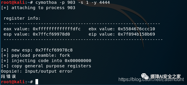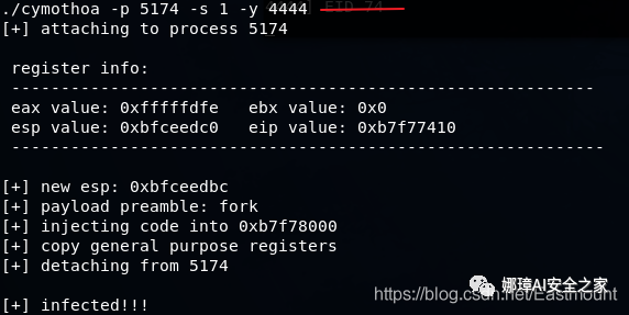在实战中你需要对目标机上传编译好的Cymothoa进行后门注入,成功则如下图所示。