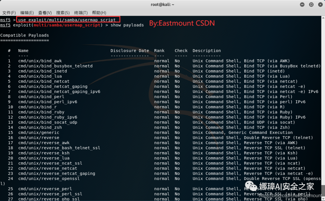 第五步,查看该漏洞利用模块可供选择的攻击载荷模块。