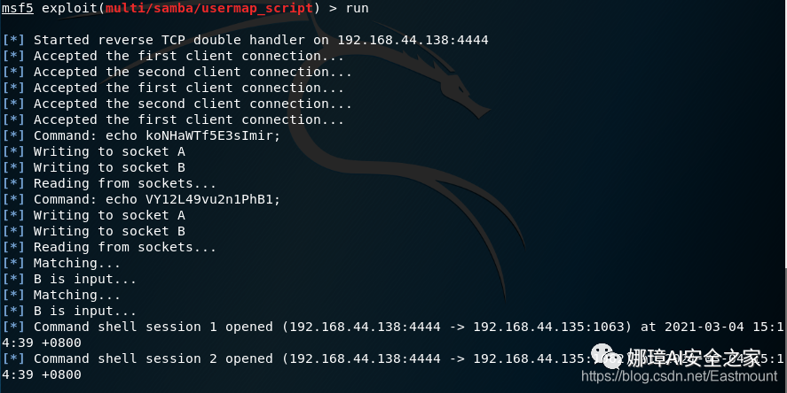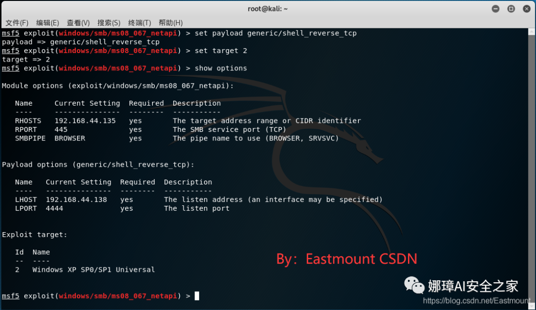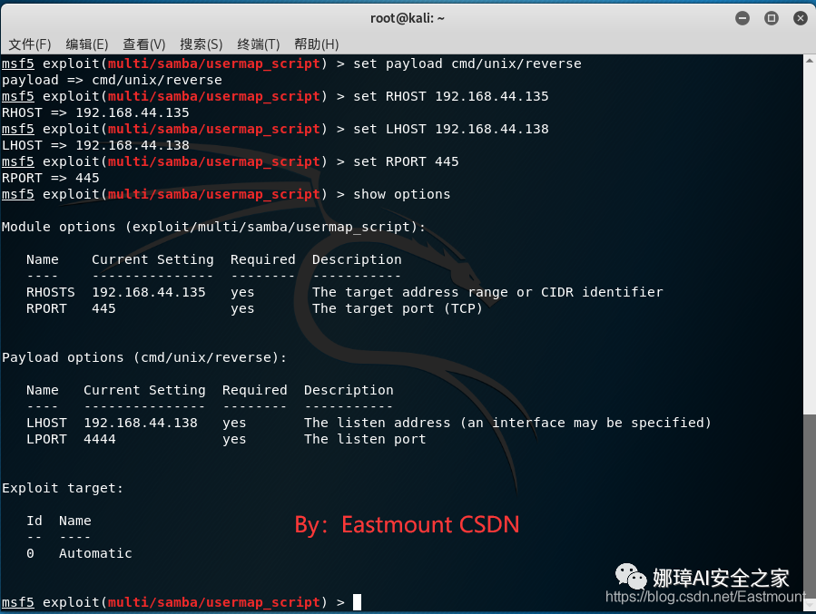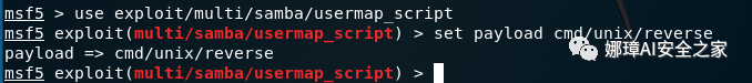 收集到目标主机相关信息后,为其选择正确的Exploit和合适的Payload,然后发起攻击。作者这里选择Samba 3.x服务进行漏洞利用。