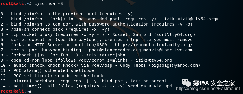 Cymothoa有很多的后门 shellcode,这些shellcode可以通过-S参数来查看。