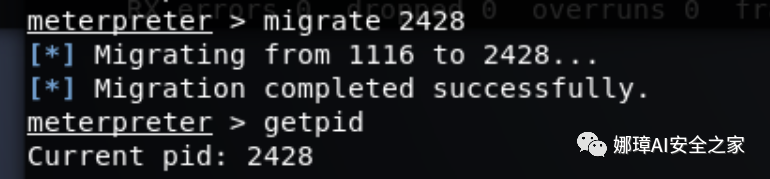 完成进程迁移后,再次输入getpid命令查看Meterpreter Shel的进程号,发现PID已经变成了2428,说明已经成功迁移到Explorer.exe进程里,原先PID为1116的进程会自动关闭,如图所示。