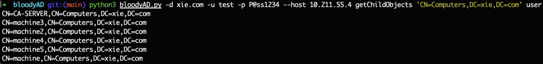 python3 bloodyAD.py -d xie.com -u test -p [email protected] --host 10.211.55.4 getChildObjects 'CN=Computers,DC=xie,DC=com' user