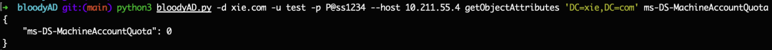python3 bloodyAD.py -d xie.com -u test -p [email protected] --host 10.211.55.4 getObjectAttributes 'DC=xie,DC=com' ms-DS-MachineAccountQuota