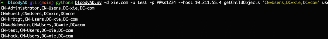 python3 bloodyAD.py -d xie.com -u test -p [email protected] --host 10.211.55.4 getChildObjects 'CN=Users,DC=xie,DC=com' user