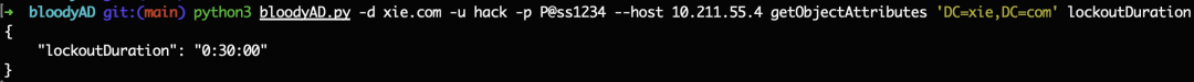 python3 bloodyAD.py -d xie.com -u hack -p [email protected] --host 10.211.55.4 getObjectAttributes 'DC=xie,DC=com' lockoutDuration