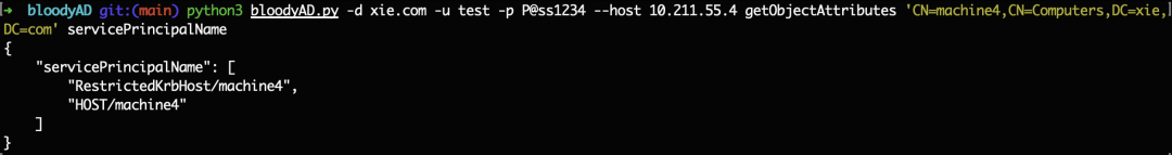 python3 bloodyAD.py -d xie.com -u test -p [email protected] --host 10.211.55.4 getObjectAttributes 'CN=machine4,CN=Computers,DC=xie,DC=com' servicePrincipalName