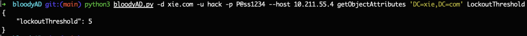 python3 bloodyAD.py -d xie.com -u hack -p [email protected] --host 10.211.55.4 getObjectAttributes 'DC=xie,DC=com' LockoutThreshold