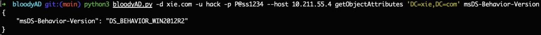 python3 bloodyAD.py -d xie.com -u hack -p [email protected] --host 10.211.55.4 getObjectAttributes 'DC=xie,DC=com' msDS-Behavior-Version