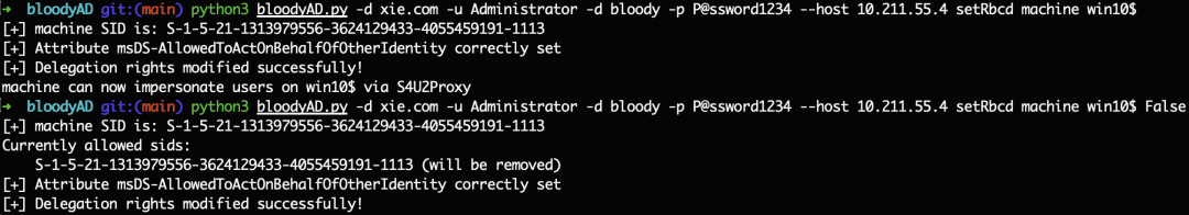 python3 bloodyAD.py -d xie.com -u Administrator -d bloody -p [email protected] --host 10.211.55.4 setRbcd machine win10$ False
