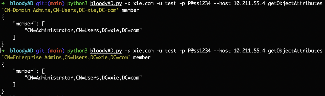 python3 bloodyAD.py -d xie.com -u test -p [email protected] --host 10.211.55.4 getObjectAttributes 'CN=Domain Admins,CN=Users,DC=xie,DC=com' member