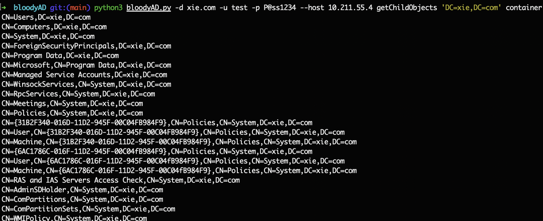 python3 bloodyAD.py -d xie.com -u test -p [email protected] --host 10.211.55.4 getChildObjects 'DC=xie,DC=com' container