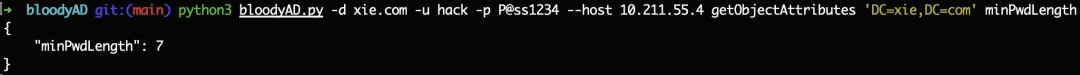python3 bloodyAD.py -d xie.com -u hack -p [email protected] --host 10.211.55.4 getObjectAttributes 'DC=xie,DC=com' minPwdLength