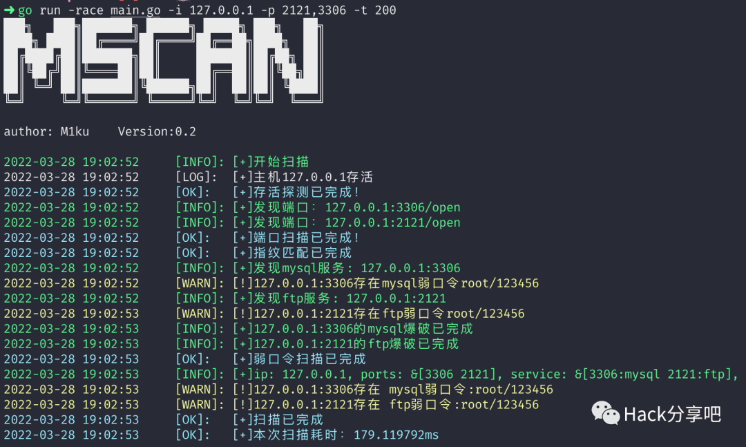 #指定爆破模块mscan -i 127.0.0.1 -p 22 -m ssh -t 100#默认全协议爆破(需发现协议端口存在)mscan -i 127.0.0.1 -t 100