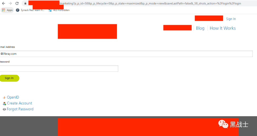 对于那些不熟悉Liferay的人来说,CMS为应用程序工作流使用了portlet,它的参数是数字中的p_p_id。对于该应用程序,可以通过将参数值更改为58来访问登录portlet。在正常的登录页面中,只有登录表单是可访问的。然而,通过直接访问portlet,可以达到Create Account功能,然后在不需要适当的授权情况下就可以进行自注册并访问内部应用程序。